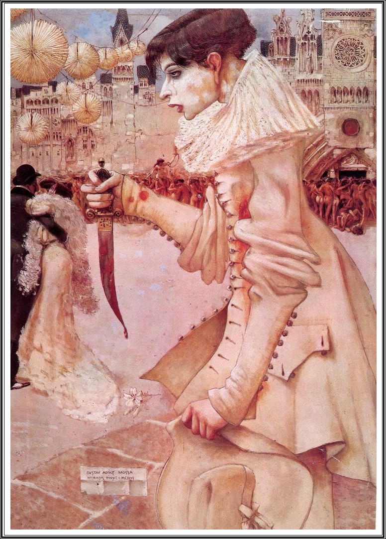 D’où cette image qui peut-être résume mieux que tout le reste la polysémie, l’outrance et la mélancolie de cette figure, le Pierrot s’en va de Gustav A. Mossa (1906). Errant tel un somnambule en proie à une idée fixe de monomane au milieu de l’orgie où s’enchevêtrent les corps nus sur le parvis de l’église gothique (ils semblent d’ailleurs s’y diriger en vue d’une massive profanation) et où triomphe, obscène, la Femme (Mossa revient ici à son grand thème du carnaval des damnés), Pierrot tient dans sa main le poignard encore ensanglanté (le rouge tâche ici et là son costume immaculé qui contraste avec le ton des chairs exhibées). Un couple bourgeois titube en route vers l’orgie, et semble, en s’opposant au meurtrier solitaire, rejouer le drame de son cocufiage. Traumatisé par son geste, Pierrot semble prêt à le refaire, dans une boucle infinie qui ne saurait apporter de repos à son âme éreintée.